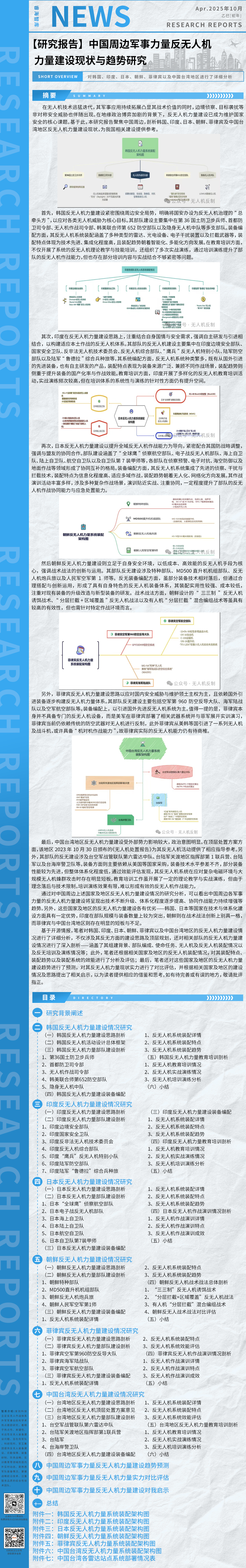 本报告根据开源信息,搜集比对分析了俄乌双方无人机装备、反无人装备性能特点,以相关无人机攻防作战新闻为切入点,总结了现代战争无人攻防作战样式,重点梳理了反无人机作战能力需求、面临困难、主要战法及发展重点,供读者借鉴和参考。