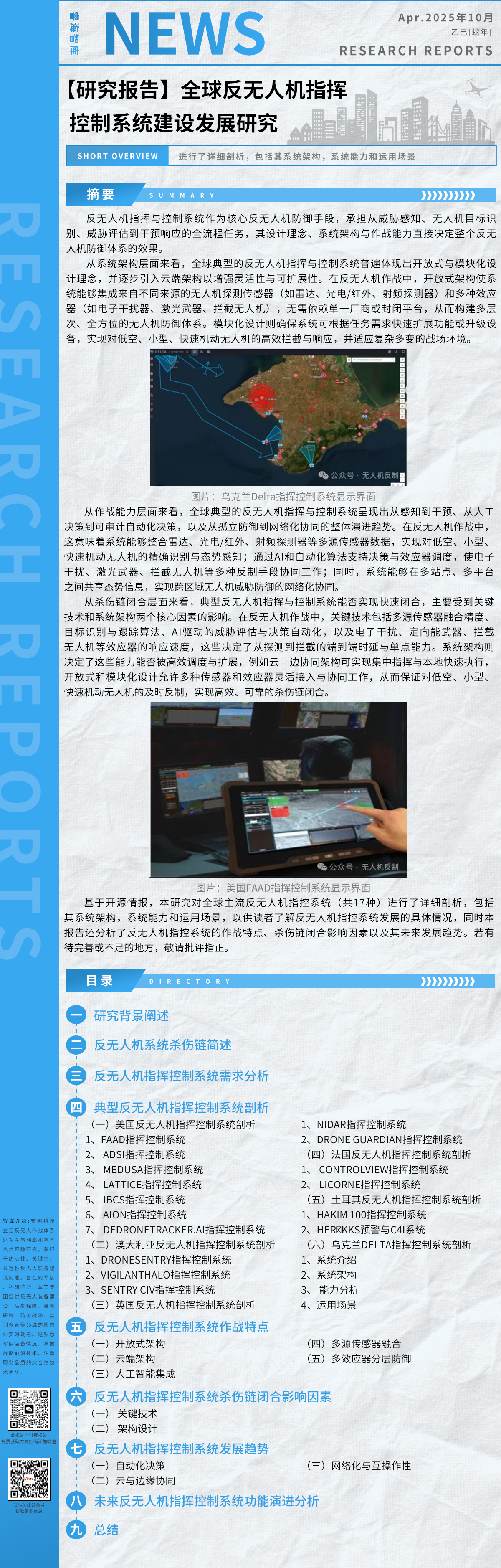 本报告根据开源信息,搜集比对分析了俄乌双方无人机装备、反无人装备性能特点,以相关无人机攻防作战新闻为切入点,总结了现代战争无人攻防作战样式,重点梳理了反无人机作战能力需求、面临困难、主要战法及发展重点,供读者借鉴和参考。