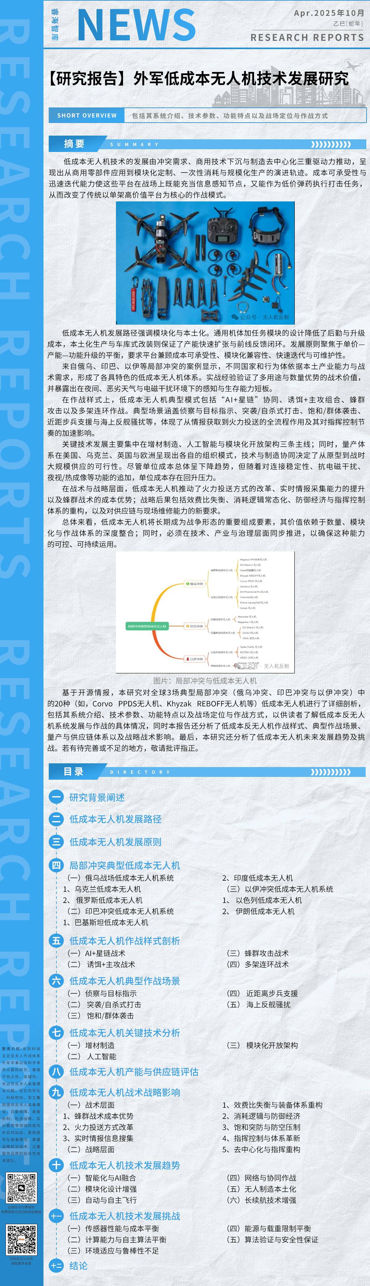 本报告根据开源信息,搜集比对分析了俄乌双方无人机装备、反无人装备性能特点,以相关无人机攻防作战新闻为切入点,总结了现代战争无人攻防作战样式,重点梳理了反无人机作战能力需求、面临困难、主要战法及发展重点,供读者借鉴和参考。
