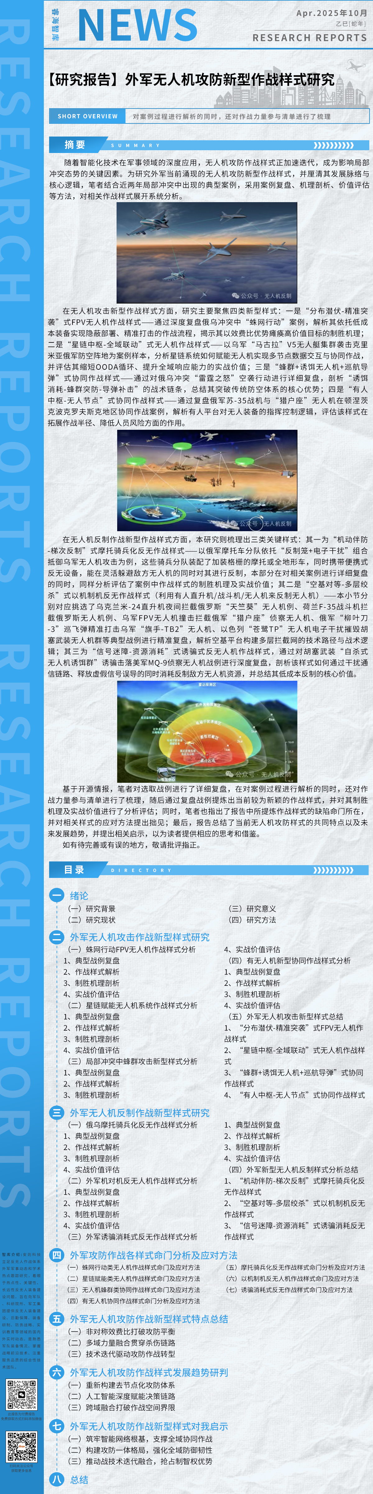 本报告根据开源信息,搜集比对分析了俄乌双方无人机装备、反无人装备性能特点,以相关无人机攻防作战新闻为切入点,总结了现代战争无人攻防作战样式,重点梳理了反无人机作战能力需求、面临困难、主要战法及发展重点,供读者借鉴和参考。