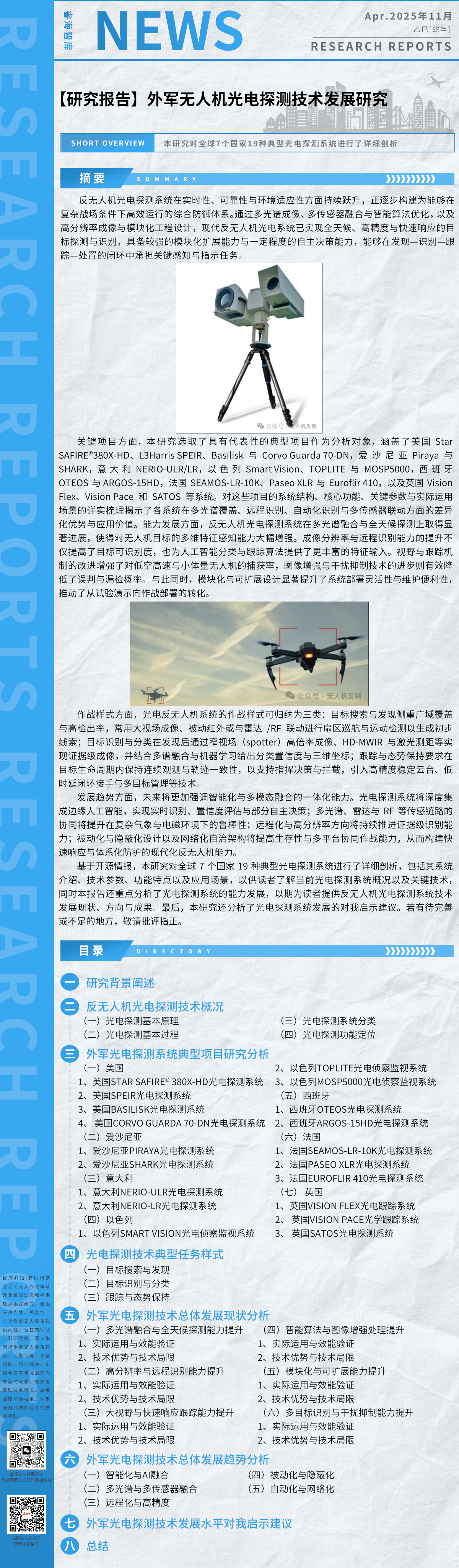 本报告在充分研究分析美军、俄罗斯、乌克兰、以色列、澳大利亚、英国、德国、新加坡等研制的反无人机系统基础上,遴选了技术成熟、性能较强、经过能力检验评估的有典型代表性的反无人机系统,分别从基本情况、技术参数、实战能力三个方面进行详细阐述分析,并梳理了其他反无人机分系统研制动态,供读者学习借鉴。
