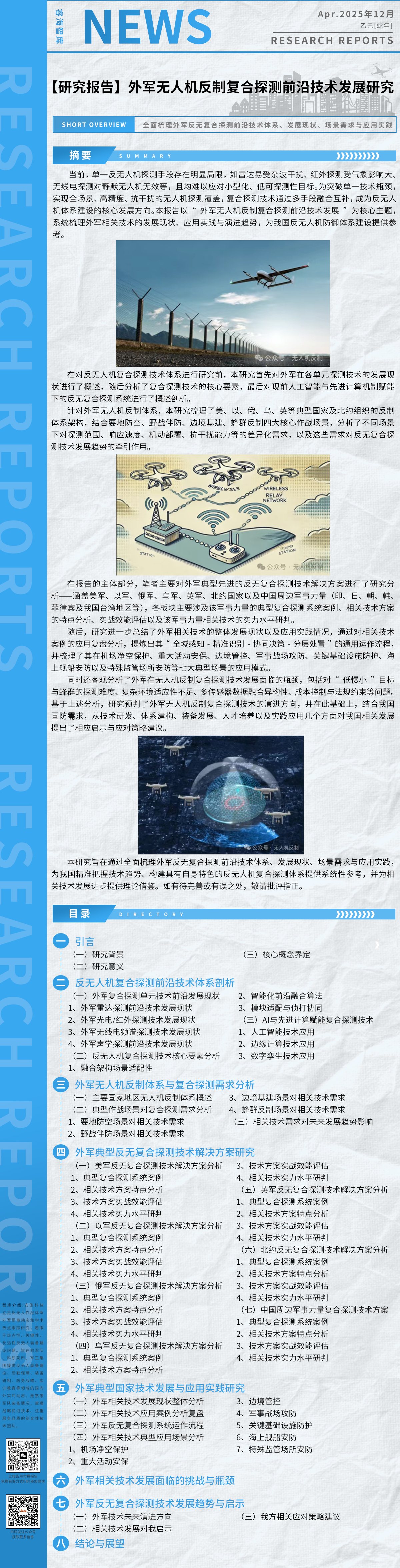 本报告在充分研究分析美军、俄罗斯、乌克兰、以色列、澳大利亚、英国、德国、新加坡等研制的反无人机系统基础上,遴选了技术成熟、性能较强、经过能力检验评估的有典型代表性的反无人机系统,分别从基本情况、技术参数、实战能力三个方面进行详细阐述分析,并梳理了其他反无人机分系统研制动态,供读者学习借鉴。