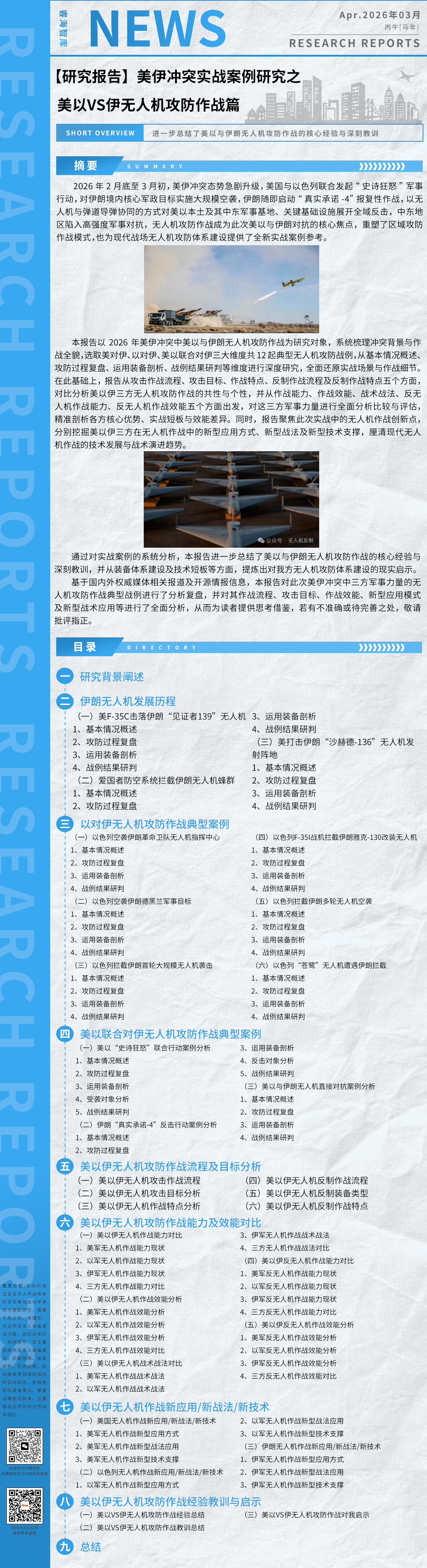 本报告根据开源信息,搜集比对分析了俄乌双方无人机装备、反无人装备性能特点,以相关无人机攻防作战新闻为切入点,总结了现代战争无人攻防作战样式,重点梳理了反无人机作战能力需求、面临困难、主要战法及发展重点,供读者借鉴和参考。