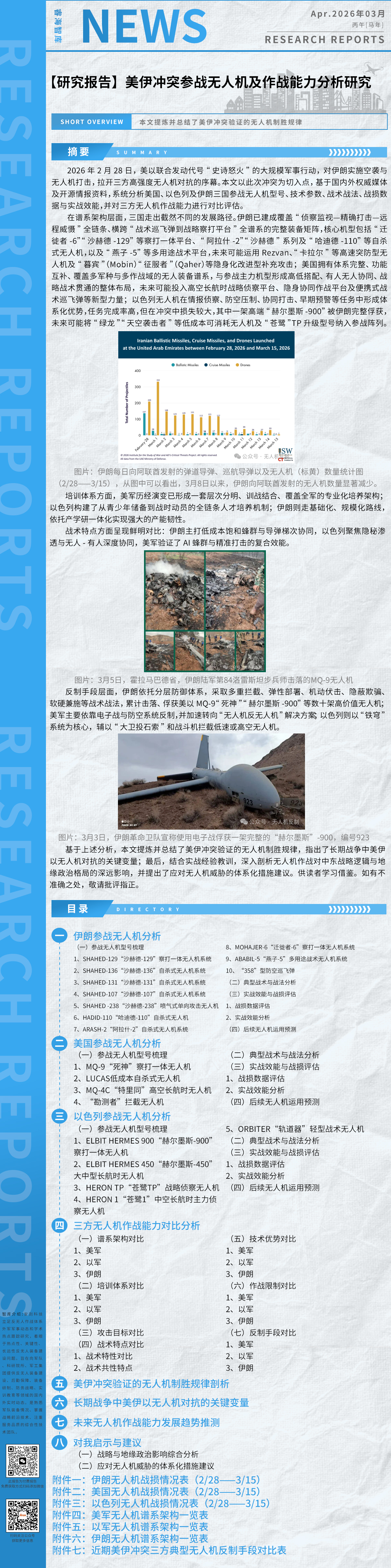 本报告根据开源信息,搜集比对分析了俄乌双方无人机装备、反无人装备性能特点,以相关无人机攻防作战新闻为切入点,总结了现代战争无人攻防作战样式,重点梳理了反无人机作战能力需求、面临困难、主要战法及发展重点,供读者借鉴和参考。