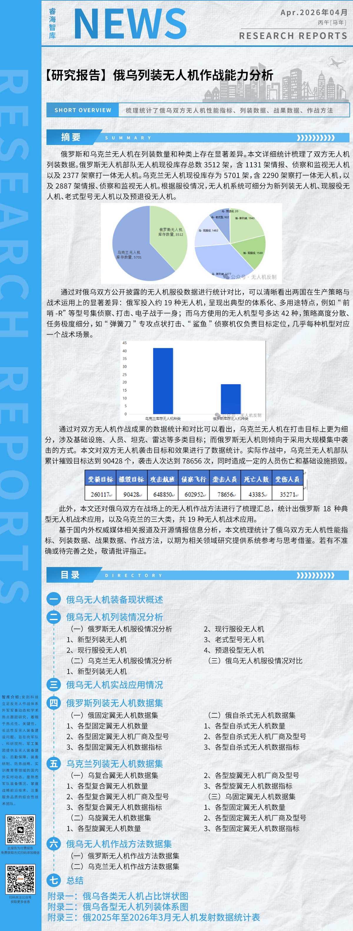 本报告根据开源信息,搜集比对分析了俄乌双方无人机装备、反无人装备性能特点,以相关无人机攻防作战新闻为切入点,总结了现代战争无人攻防作战样式,重点梳理了反无人机作战能力需求、面临困难、主要战法及发展重点,供读者借鉴和参考。
