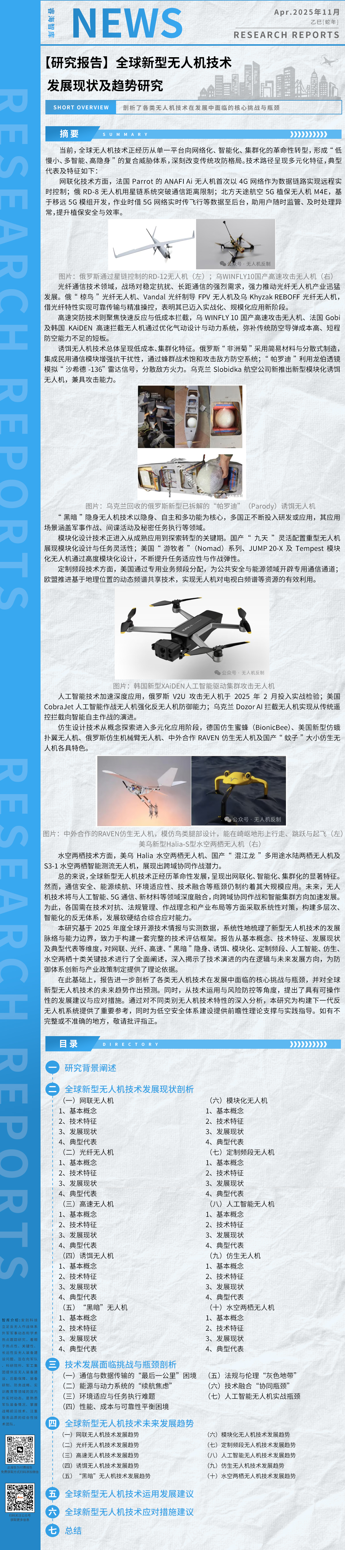 本报告根据开源信息,搜集比对分析了俄乌双方无人机装备、反无人装备性能特点,以相关无人机攻防作战新闻为切入点,总结了现代战争无人攻防作战样式,重点梳理了反无人机作战能力需求、面临困难、主要战法及发展重点,供读者借鉴和参考。