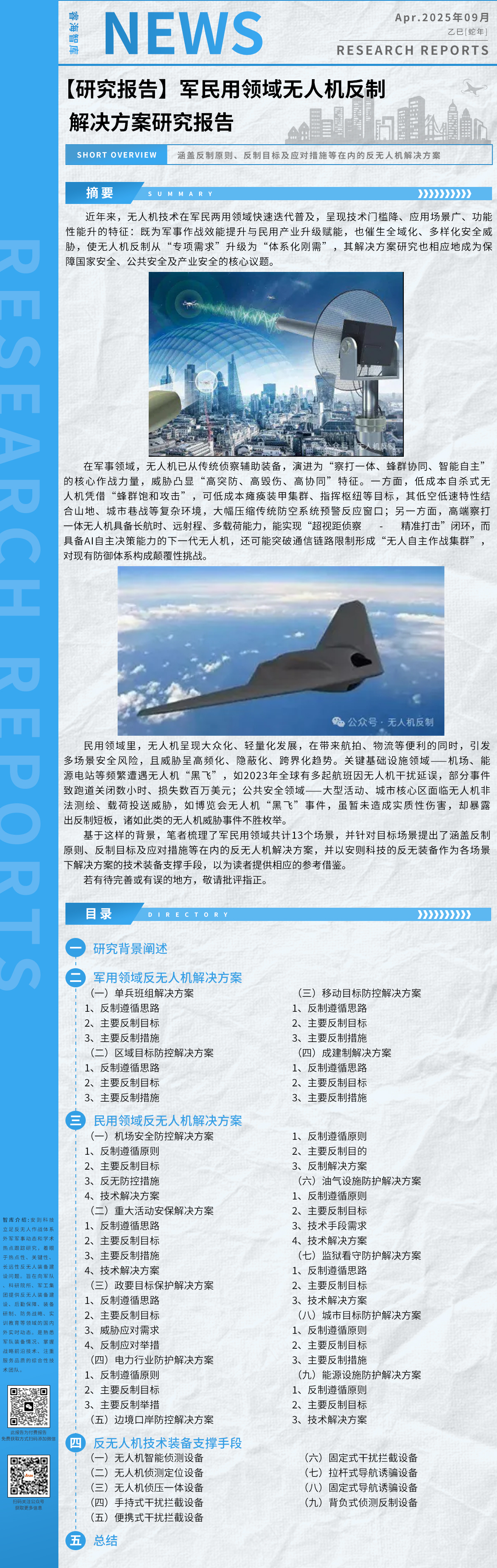 本报告根据开源信息,搜集比对分析了俄乌双方无人机装备、反无人装备性能特点,以相关无人机攻防作战新闻为切入点,总结了现代战争无人攻防作战样式,重点梳理了反无人机作战能力需求、面临困难、主要战法及发展重点,供读者借鉴和参考。