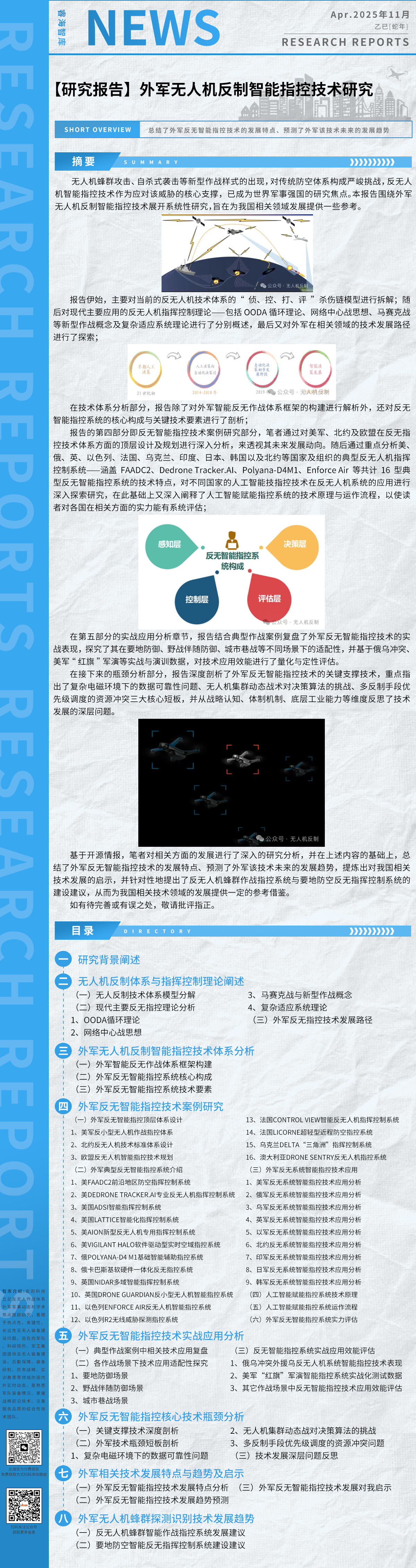 本报告根据开源信息,搜集比对分析了俄乌双方无人机装备、反无人装备性能特点,以相关无人机攻防作战新闻为切入点,总结了现代战争无人攻防作战样式,重点梳理了反无人机作战能力需求、面临困难、主要战法及发展重点,供读者借鉴和参考。