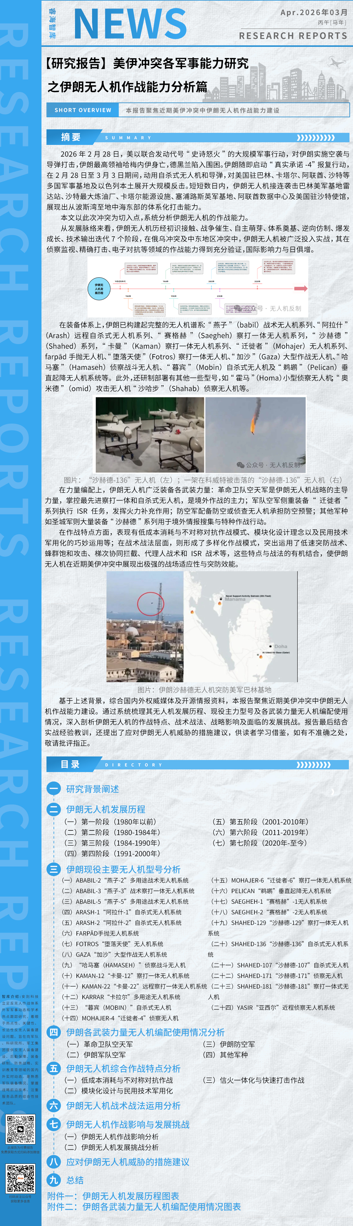 本报告根据开源信息,搜集比对分析了俄乌双方无人机装备、反无人装备性能特点,以相关无人机攻防作战新闻为切入点,总结了现代战争无人攻防作战样式,重点梳理了反无人机作战能力需求、面临困难、主要战法及发展重点,供读者借鉴和参考。