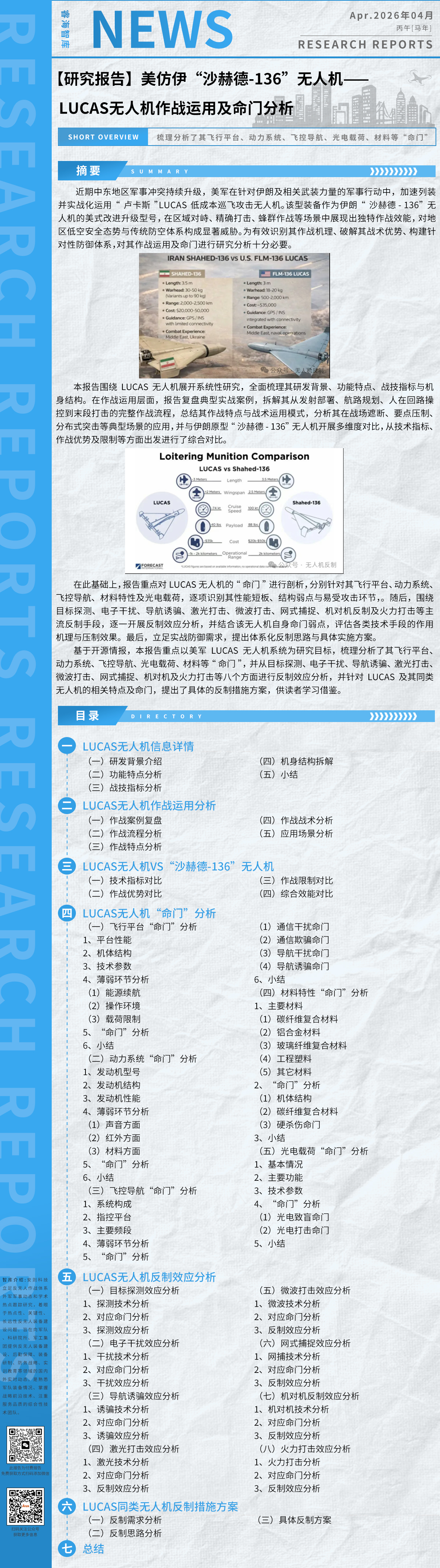 本报告根据开源信息,搜集比对分析了俄乌双方无人机装备、反无人装备性能特点,以相关无人机攻防作战新闻为切入点,总结了现代战争无人攻防作战样式,重点梳理了反无人机作战能力需求、面临困难、主要战法及发展重点,供读者借鉴和参考。