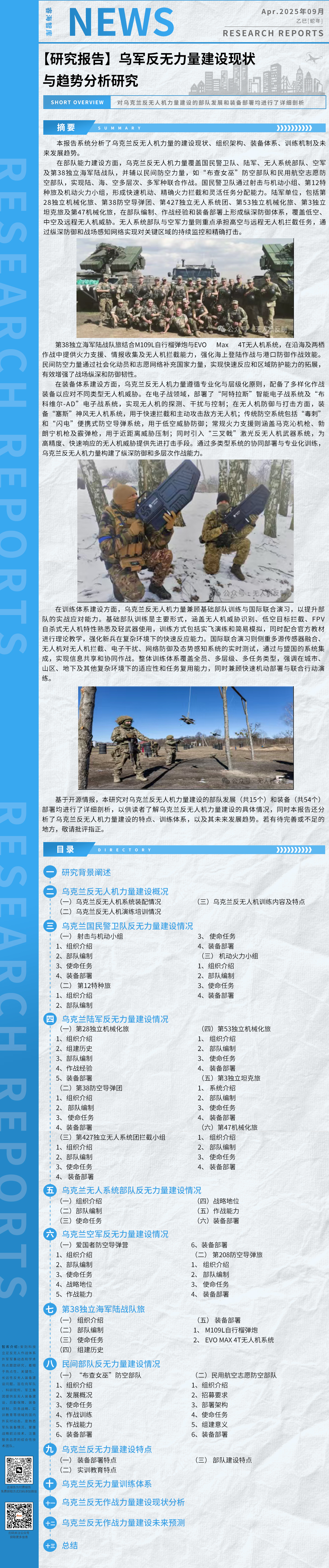 本报告根据开源信息,搜集比对分析了俄乌双方无人机装备、反无人装备性能特点,以相关无人机攻防作战新闻为切入点,总结了现代战争无人攻防作战样式,重点梳理了反无人机作战能力需求、面临困难、主要战法及发展重点,供读者借鉴和参考。